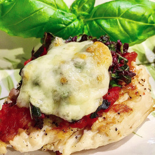 Chicken, cauliflower and eggplant (peeled and deseeded) grilled and topped with grilled roma tomatoes (peels and seeds removed), olive tapenade and fontina cheese.