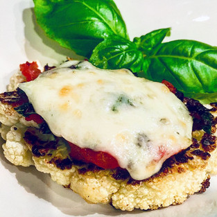 On a baking sheet covered in parchment paper, build the chicken Parmesan stacks with chicken on bottom followed by grilled Roma tomatoes, tapenade and a fontina cheese slice on top. Repeat for the four pieces of cauliflower. For the eggplant, loosely fold the ribbons in half and build the stacks. Place the sheet on Parmesans under the broiler on high until the cheese bubbles and turns slightly brown.